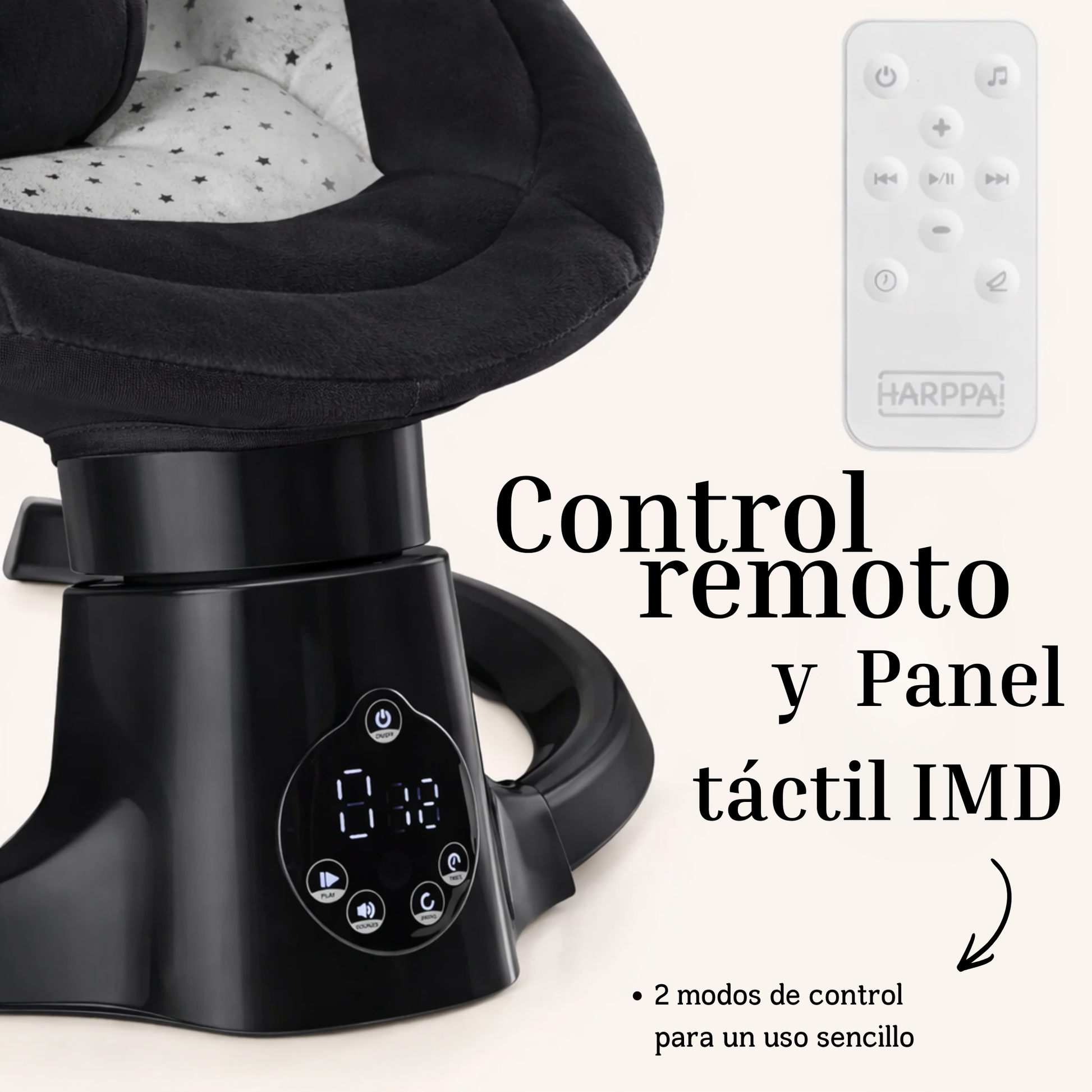 Elige la velocidad y la música desde el mando para crear un ambiente relajante que ayude a tu bebé a dormirse sin esfuerzo. -